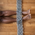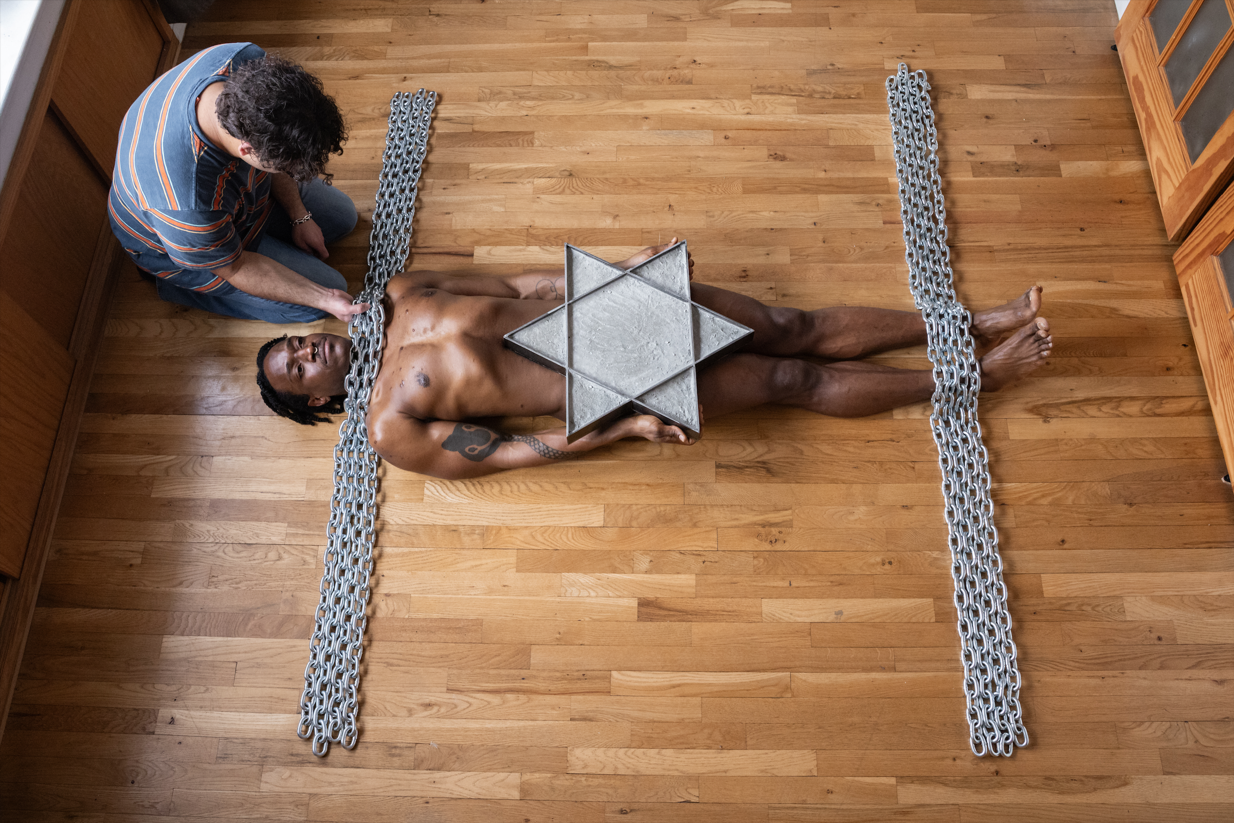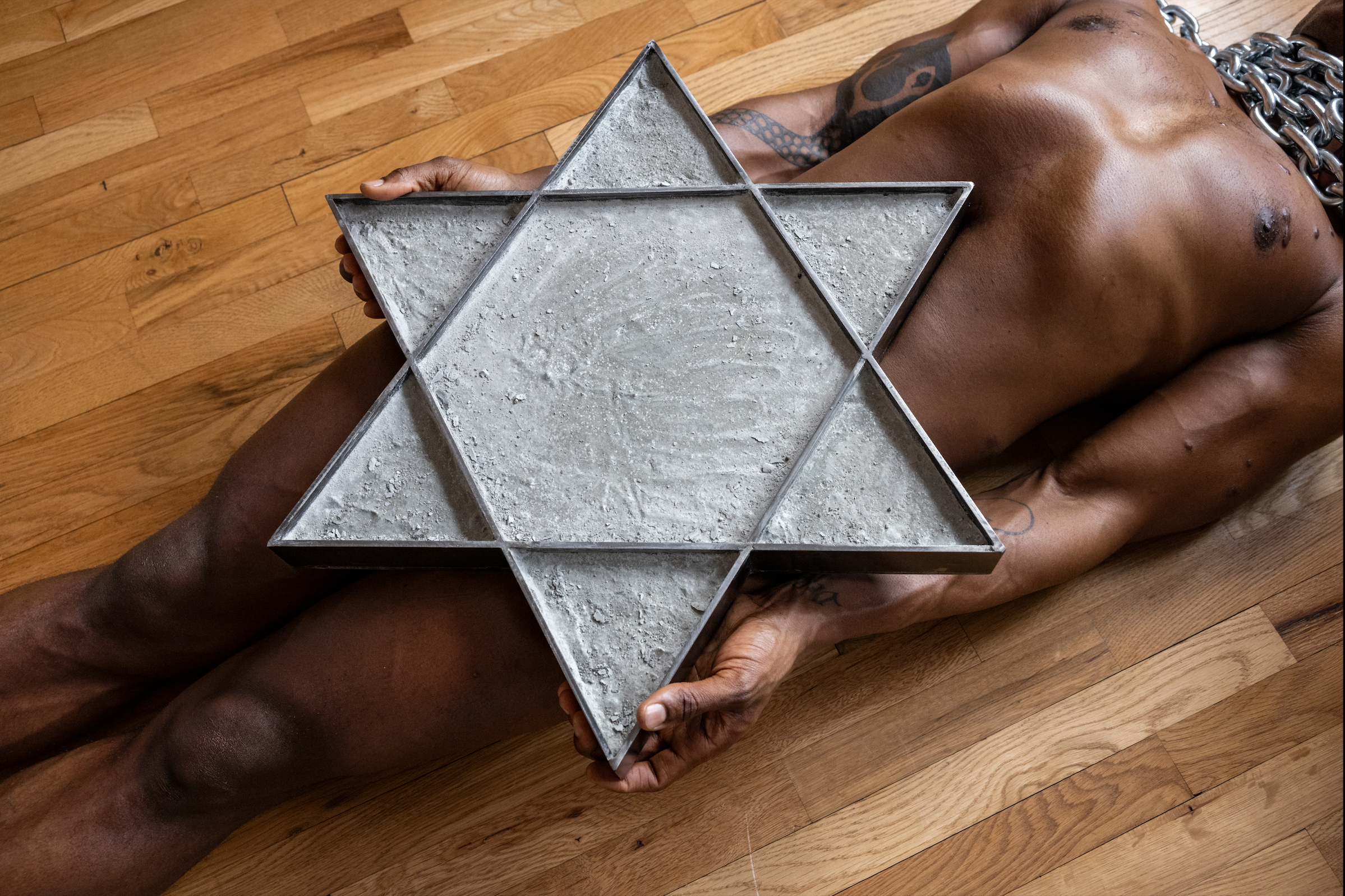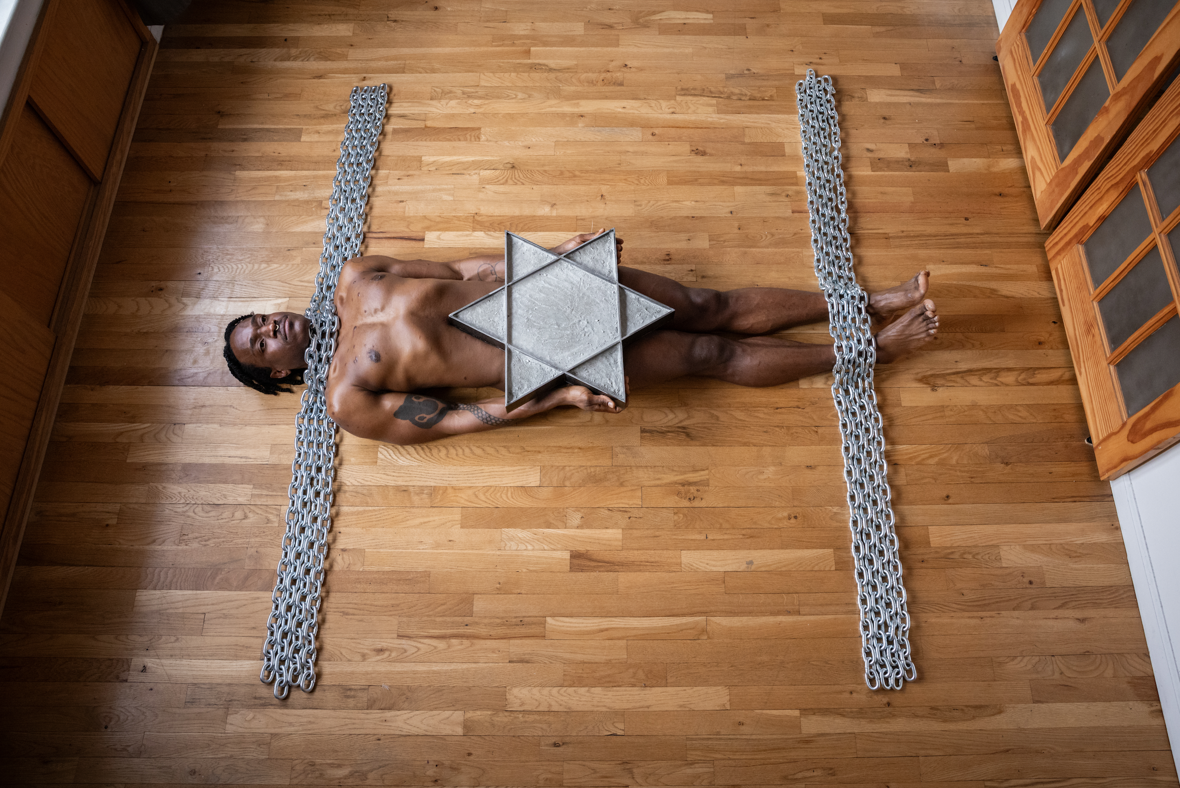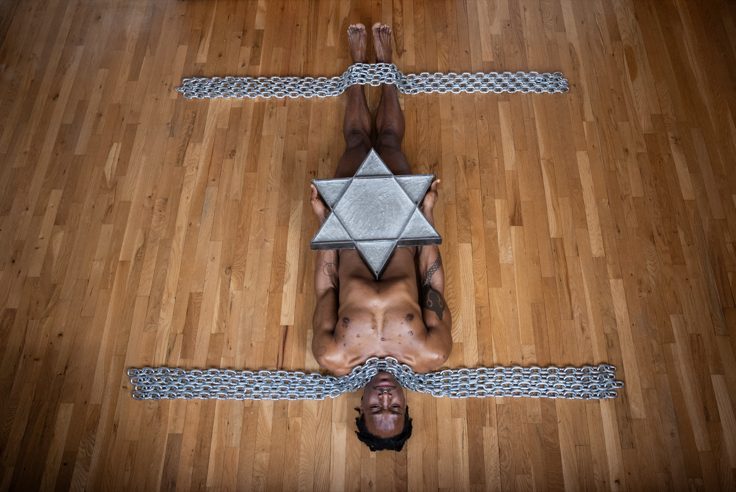 I remain pinned to the ground by an installation of iron and concrete, designed from the national flag of Israel. The structure restricts the movements of my body and diminishes my breathing and the flow of oxygen to my brain. At intervals, a person lifts the chains that obstruct my breathing, preventing me from losing consciousness due to lack of oxygen.